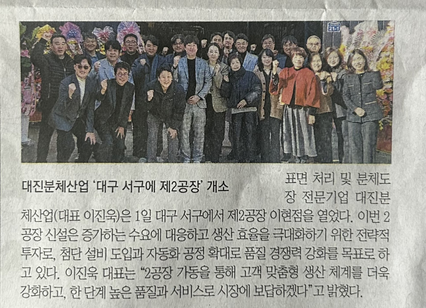 2공장 개소 신문기사 페이지 정보 작성자 최고관리자 댓글 0건 조회 112회 작성일 26-01-26 16:22 목록 본문 이전글연말 신장협의회 기부 26.01.26 다음글제12회 대구.경북 소상공인 .중소.벤처기업 대축전 25.12.05 댓글 0 댓글목록 등록된 댓글이 없습니다.